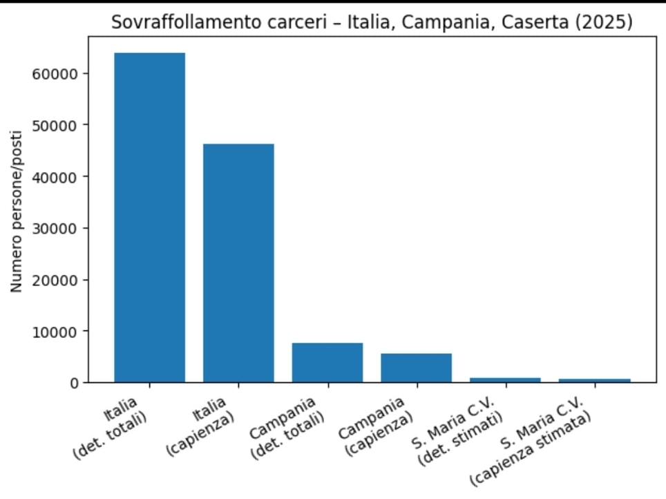 Queste morti non sono numeri astratti: rappresentano persone, storie e fallimenti sistemici nel garantire supporto psicologico e percorsi di reintegrazione sociale dignitosi. Per comprendere questa situazione è necessario guardare oltre i singoli istituti. Le cause principali sono: Capacità infrastrutturale insufficiente: nonostante alcuni piani di ristrutturazione siano stati avviati, l’incremento dei posti disponibili non compensa la crescita della popolazione detenuta. Lentezza del processo penale: una quota significativa di persone è trattenuta in attesa di giudizio o in attesa di sentenza definitiva, contribuendo all’aumento dei numeri totali. Limitato uso delle misure alternative alla detenzione: benché crescano, non sono ancora pienamente utilizzate tutte le possibilità previste per legge, come affidamento in prova o pena domiciliare, specie per reati minori o per persone con pene residue brevi. Come Garante dei detenuti della provincia di Caserta, ribadisco che la pena deve essere espiata con rispetto della dignità umana e in condizioni che favoriscano la salute, la riabilitazione e il reinserimento sociale. Le carceri non possono diventare luoghi di mera detenzione affollata, ma devono porsi come realtà in cui la pena assume anche il significato costituzionale di rieducazione. Il sistema penitenziario italiano nel 2025 è ancora in una situazione di emergenza strutturale. Serve un cambio di passo nella politica penitenziaria nazionale e locale, con investimenti mirati su: capacità ricettiva e strutture adeguate; assistenza sanitaria integrata e continua; potenziamento di percorsi alternativi alla detenzione; programmi di sostegno psicologico e sociale. Solo con interventi sistemici – e non frammentari – potremo garantire alla persona detenuta diritti fondamentali, salute e prospettive di futuro reale Italia : alla fine del 2025 i dati riportano circa 63.868 detenuti in totale, con capacità regolamentare di circa 46.124 posti: questo produce un tasso medio di oltre 138% di sovraffollamento. (Dati del Centro di Ateneo per i Diritti Umani ) Campania (che include Caserta): la regione registra 7.494 detenuti rispetto a 5.584 posti regolamentari, con un tasso di sovraffollamento molto elevato ~134%. Santa Maria Capua Vetere (Caserta): nelle mie visite ho rilevato celle progettate per 4 persone occupate da fino a 6 detenuti, segno di condizioni che superano il 150% di sovraffollamento in alcune sezioni Dati sul sovraffollamento carcerario nazionale aggiornati al 2025: ~62.728 detenuti in circa 46.717 posti, tasso di sovraffollamento nazionale 134–138%. Situazione della regione Campania: ~7.494 detenuti su ~5.584 posti con sovraffollamento ~134%. (Dati del ristretti.org)